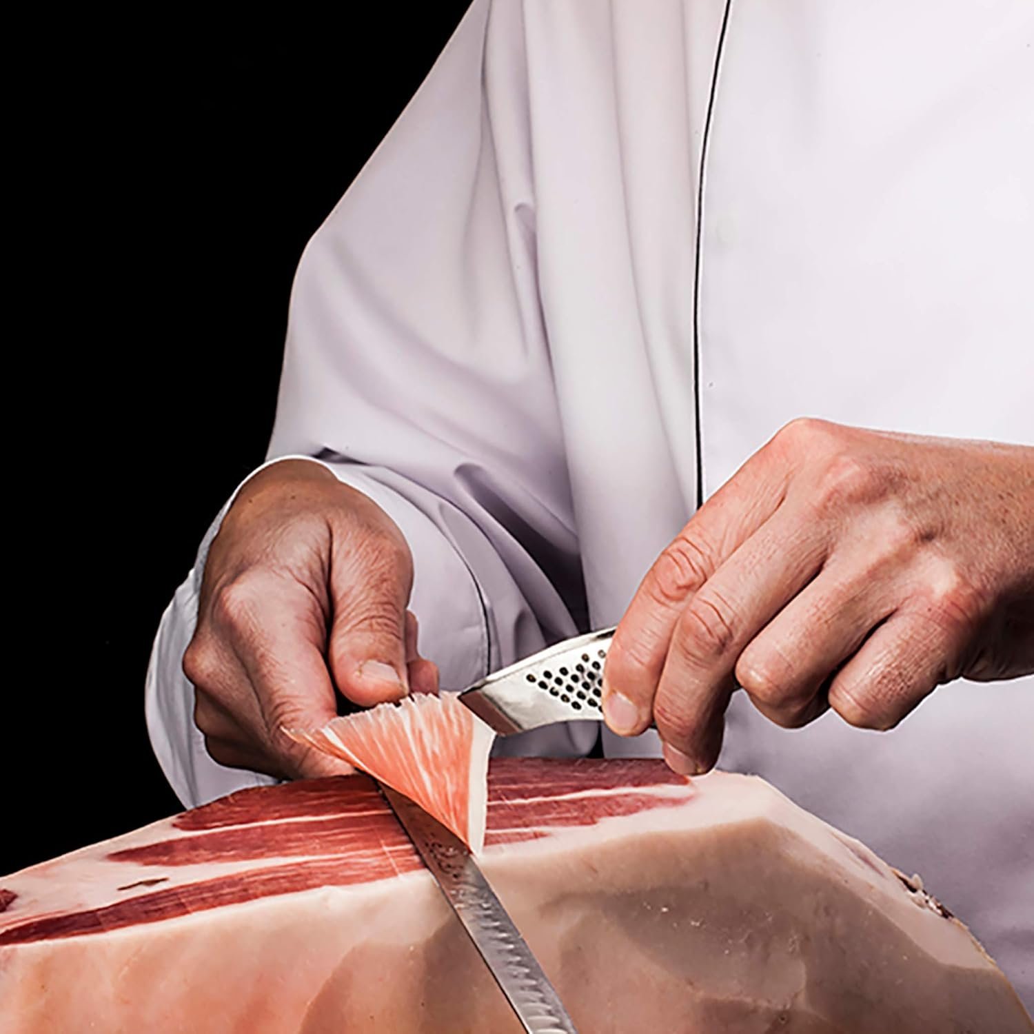 Empieza a cortar desde la parte más alta de la pieza, la pezuña, hasta la punta. Con el cuchillo bien sujeto y en horizontal al jamón, ve sacando finas lonchas e intenta mantener un corte recto.